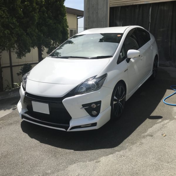 今回は、エアロ、新品19インチアルミホイールを装着したこちらのプリウスを研磨し、