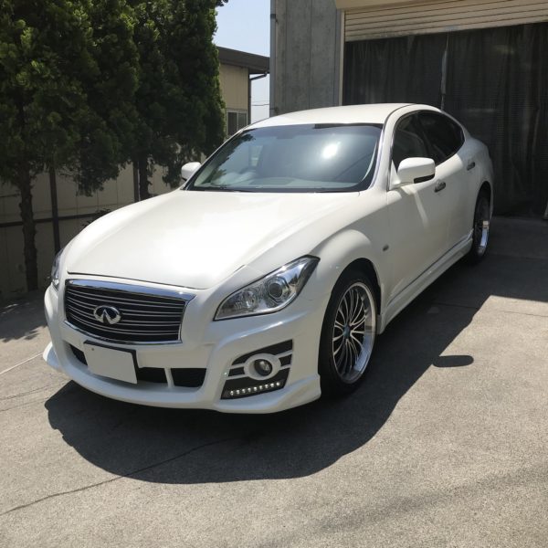 今回は、エアロ、新品20インチアルミホイールを装着したこちらのフーガを研磨し、