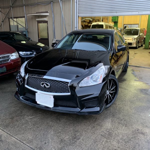 今回はエアロ、新品20インチアルミホイールを装着したこちらのスカイラインを研磨し、